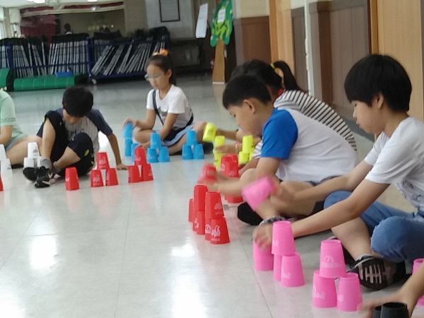 다음 순서로 학생들은 스태킹 컵을 실제로 쌓거나 내리는 활동을 하였다. 처음엔 급한 마음에 컵을 쓰러뜨리기도 하고, 긴장된 마음에 손에 힘을 준 탓으로 컵을 쌓거나 내리는 활동에서 요란한 소리를 내기도 하였다. 그러나 몇 차례 연습으로 손에 힘을 주면 스피드가 떨어지고 실수가 잦아 정확도가 떨어진다는 것을 깨우치고 오른손, 왼손을 규칙에 따라 재빠르게 움직이며 스태킹 컵을 쌓고 내리면서 즐겁게 활동하였다.
