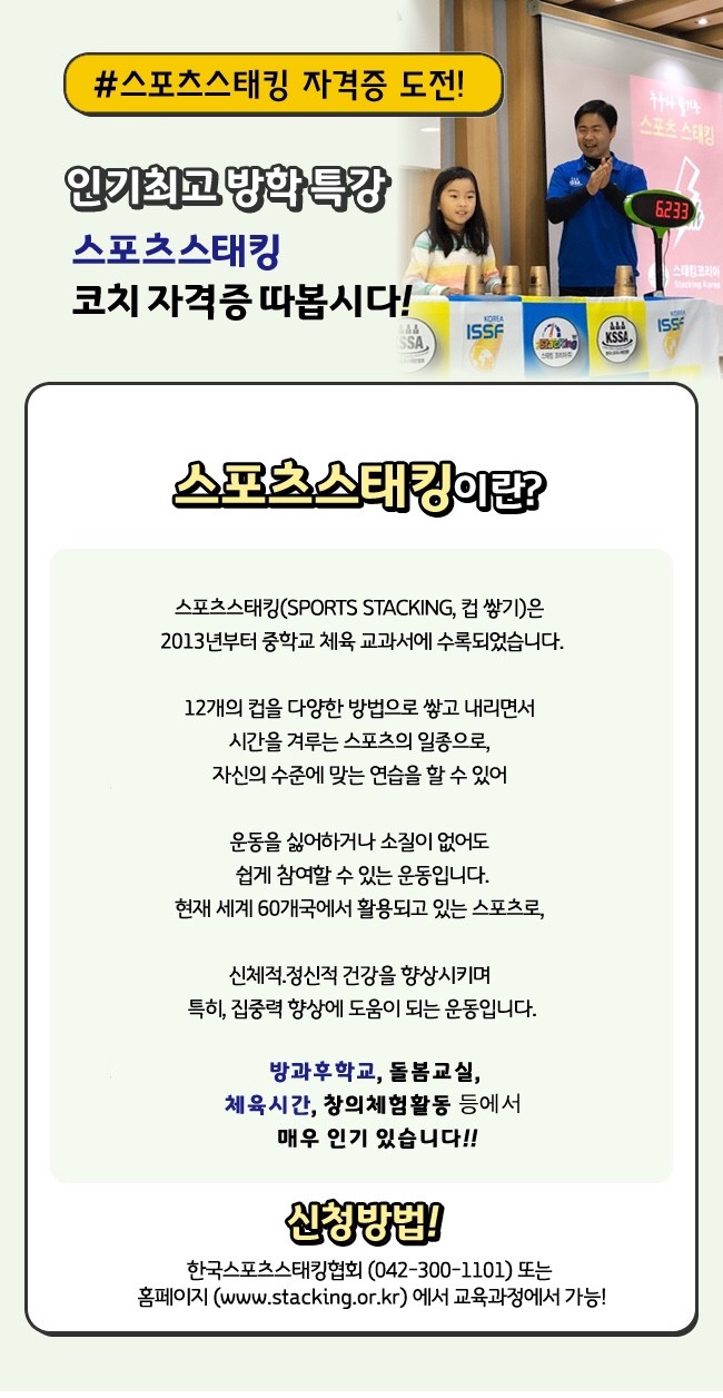 '스포츠스태킹 코치 자격증반' 연수는 수강생의 자녀들도 함께 일부 참여함하여 부모자녀간의 소통과 화목을 다졌으며, 코로나19 확산 방지를 위해 철저한 방역과 예방 수칙을 준수하며 진행됐다.