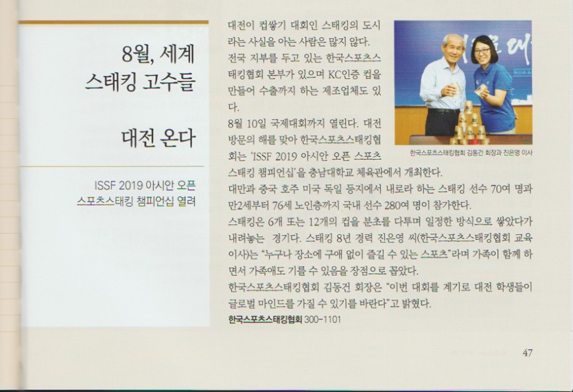 대전 월간지 잇츠 대전에 2019.8. 10.대전 충남대학교에서 열리는 ISSF 2019 아시안 오픈 스포츠스태킹 챔피언십 대회 및 한국스포츠스태킹협회 회장님 인터뷰가 실렸습니다.