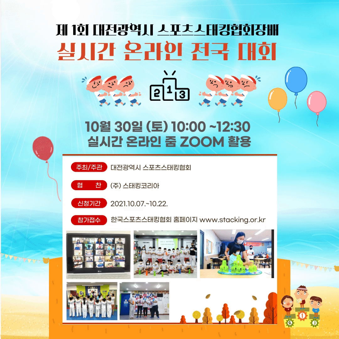 작성자 한국스포츠스태킹협회 댓글 1건 조회 1,332회 작성일 21-10-09 16:22❍ 대 회 명 : 제1회 대전광역시스포츠스태킹협회장배 실시간 온라인 전국 스포츠스태킹대회